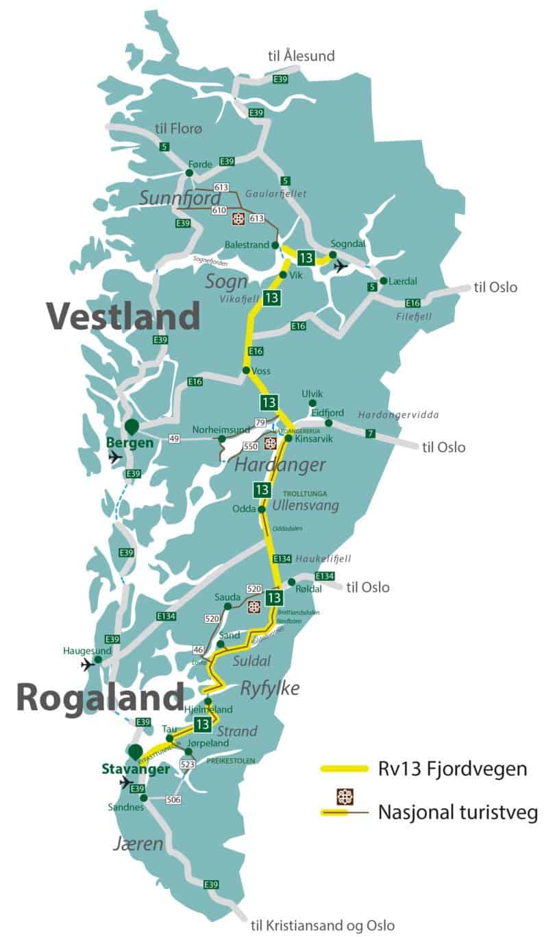 Dei norske fjordane er kåra til det beste reisemålet i heile verda, og tre av dei nasjonale turistvegane ligg langs riksveg 13. Fjordvegen Riksveg 13 følgjer opp turistvegsatsinga og anna reiselivssatsing knytt til vegen, slik at reiselivsbedrifter og samfunna langs Fjordvegen får auka si konkurransekraft i høve til både busetnad og vegfarande gjester heile året.
