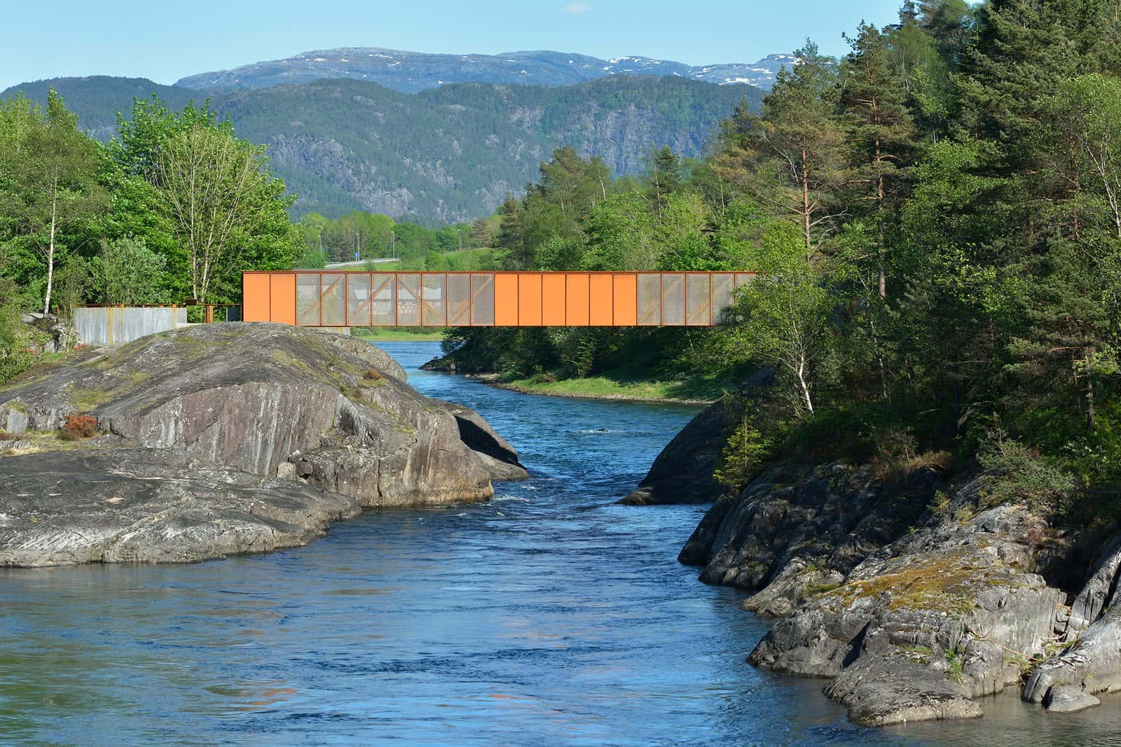 Høsebrua, gangbru over Suldalslågen ved Sand i Suldal, avstikker fra Nasjonal turistveg Ryfylke. ©Foto: Jarle Wæhler / Statens vegvesen